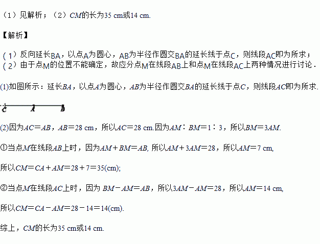 (2)在(1)中,如果AB=28 cm,线段BC上有一点M,且线段AM∶BM=1∶3,求线段CM的长.