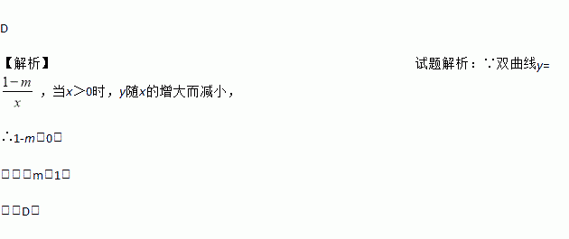 对于双曲线y=,当x>0时,y随x的增大而减小,则m的取值范围为( )