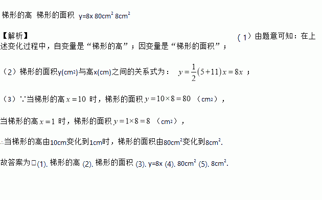 梯形的高 梯形的面积 y=8x 80cm2 8cm2 【解析】(1)由题意可知:在上述变化过程中,自变量是“梯形的高”;因变量是“梯形的面积”; (2)梯形的面积y(cm2)与高x(cm)之间的关系式为: ; (3)∵当梯形的高时,梯形的面积(cm2), 当梯形的高时,梯形的面积(cm2), ∴当梯形的高由10cm变化到1cm时,梯形的面积由80cm2变化到8cm2....