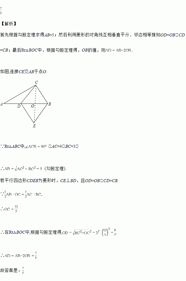 如图在Rt△ABC中,∠ACB=90°,AC=4,BC=3,D为斜边AB上一点,以CD、CB为边作平行四边形CDEB,当AD=_____,平行四边形CDEB为菱形.