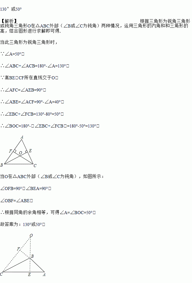 在△ABC中,50°,高BE、CF所在直线交于点O,且点O不与点B、C重合,则的度数为__________.
