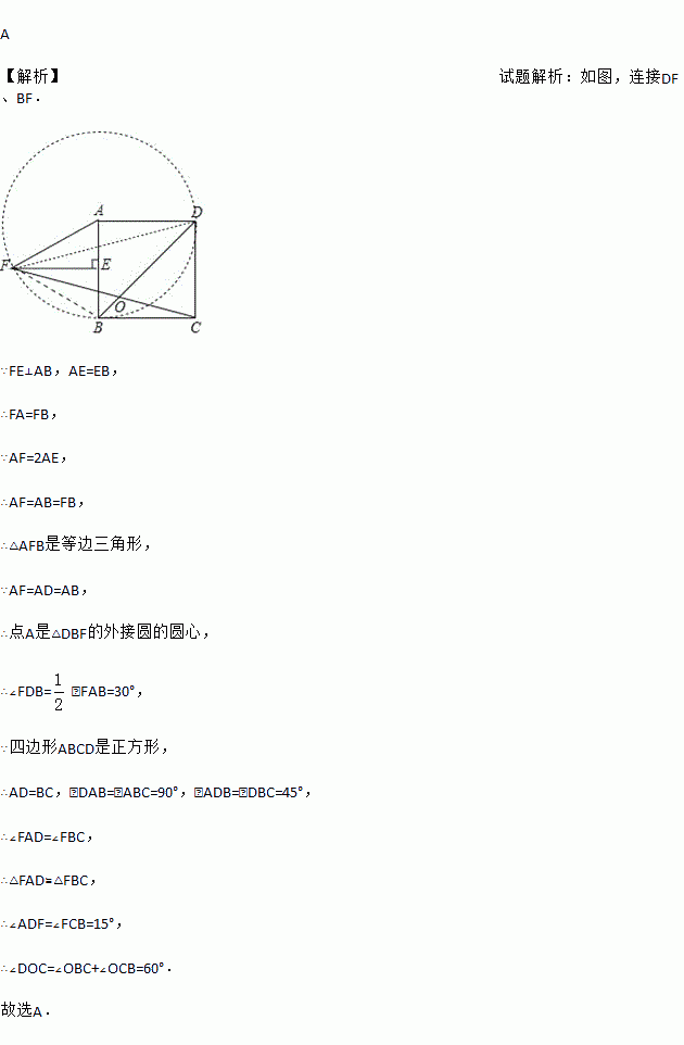 如图,正方形ABCD中,E为AB中点,FE⊥AB,AF=2AE,FC交BD于O,则∠DOC的度数为( )
