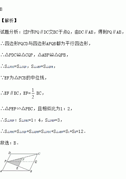 如图,P为平行四边形ABCD的边AD上的一点,E,F分别为PB,PC的中点,△PEF,△PDC,△PAB的面积分别为S,S1,S2.若S=3,则S1+S2的值为( )