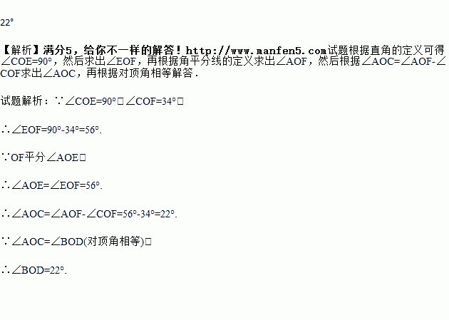 如图,已知直线AB和CD相交于O点,∠COE是直角,OF平分∠AOE,∠COF=34°,求∠BOD的度数.