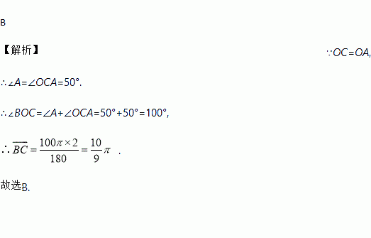 如图AB为⊙O的直径,点C在⊙O上,若∠OCA=50°,AB=4,则的长为( )