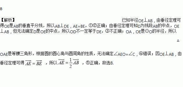 如图,△ABC内接于⊙O,半径OE⊥弦AB,垂足为D,连接AE,BE,则下列五个结论:①AB⊥DE,②AE=BE,③OD=DE,④∠AEO=∠C,⑤