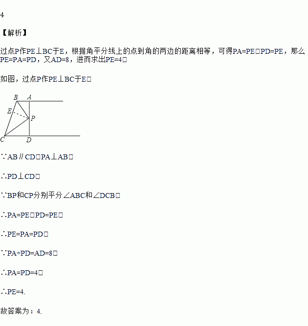 如图,AB∥CD,BP和CP分别平分∠ABC和∠DCB,AD过点P,且与AB垂直,垂足为A,交CD于D,若AD=8,则点P到BC的距离是_____.