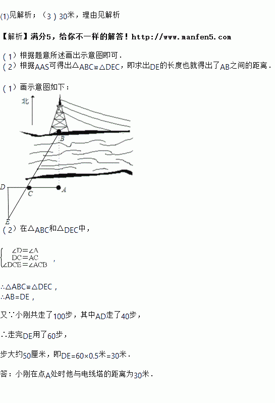 ÈçͼËùʾ,С¸ÕÕ¾ÔںӱߵÄAµã´¦,ÔÚºÓ¶ÔÃæ(С¸ÕµÄÕý±±·½Ïò)µÄB´¦ÓÐÒ»µçÊÓËþ,С¸ÕÏëÖªµÀµçÏßËþÀëËûÓжàÔ¶,ÓÚÊÇËûÏòÕýÎ÷×ßÁË20²½µ½´ïÒ»¿ÃÊ÷C´¦,½Ó׿ÌÐøÏòǰ×ßÁË20²½µ½´ïD´¦,È»ºóËû×óת90¡ãÖ±ÐÐ,µ±Ëû¿´µ½µÄµçÏßËþB,Ê÷CºÍ×Ô¼ºËù´¦µÄλÖÃEÔÚÒ»ÌõÖ±ÏßÉÏʱ,ËûÔÚÕû¸ö²½²â¹ý³ÌÖй²×ßÁË100²½.