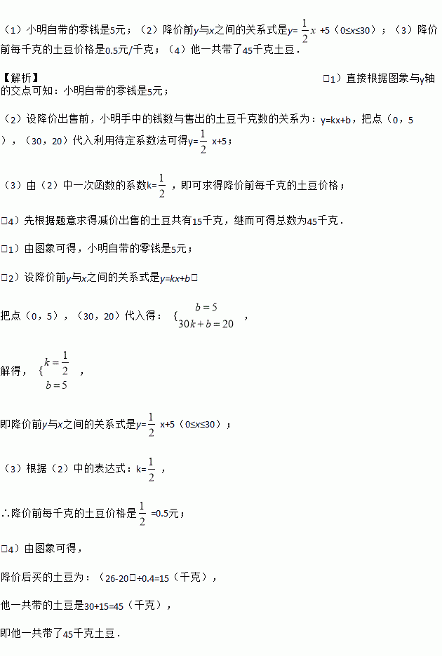 小明带着自己家种的土豆到市场去卖,他带了一些零钱备用,按市场价售出一些后,又降价出售,售出土豆的千克数与他手中持有的钱数(含备用零钱)的关系,如图所示,结合图象回答下列问题:
