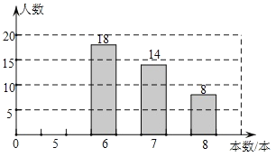 今年4月22日拉开了锦州市第七届读书节活动,某校开展了“书香校园”主题教育活动为了了解学生的课外阅读情况,学校学生会对八年级部分学生2018年以来课外阅读量进行了随机调查,整理调查结果发现,学生课外阅读的本数最少的有5本,最多的有8本,并根据调查结果绘制了不完整的图表,如图所示:![]()