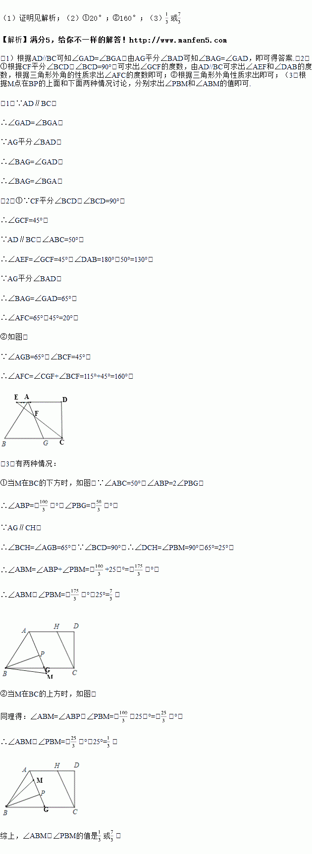 如图四边形ABCD中,AD∥BC,∠BCD=90°,∠BAD的平分线AG交BC于点G.