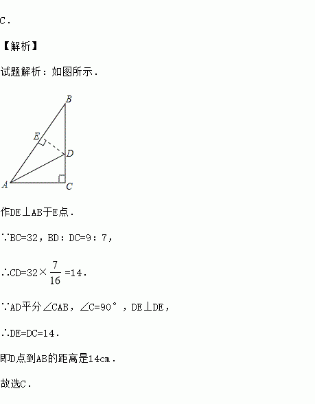 在△ABC中,∠C=90°,AD为角平分线,BC=32,BD∶DC=9∶7, 则点D到AB的距离为( )