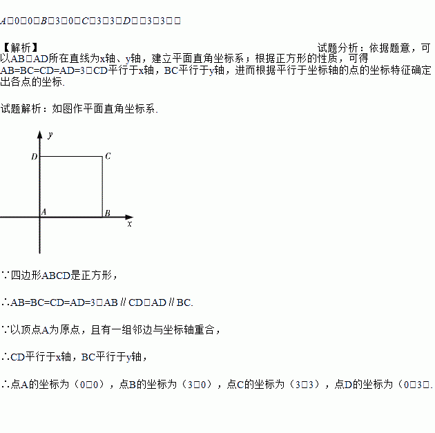 如图,正方形ABCD的边长为3,以顶点A为原点,且有一组邻边与坐标轴重合,求出正方形ABCD各个顶点的坐标.