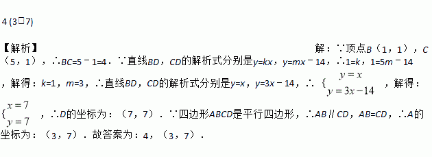 4 (3,7) 【解析】【解析】 ∵顶点B(1,1),C(5,1),∴BC=5﹣1=4.∵直线BD,CD的解析式分别是y=kx,y=mx﹣14,∴1=k,1=5m﹣14,解得:k=1,m=3,∴直线BD,CD的解析式分别是y=x,y=3x﹣14,∴ ,解得: ,∴D的坐标为:(7,7).∵四边形ABCD是平行四边形,∴AB∥CD,AB=CD,∴A的坐标为:(3,7).故答案为:4,(3,7...