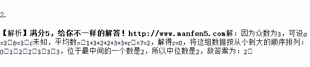 一个样本为1,3,2,2,a,b,c,已知这个样本的众数为3,平均数为2,则这组数据的中位数为______.