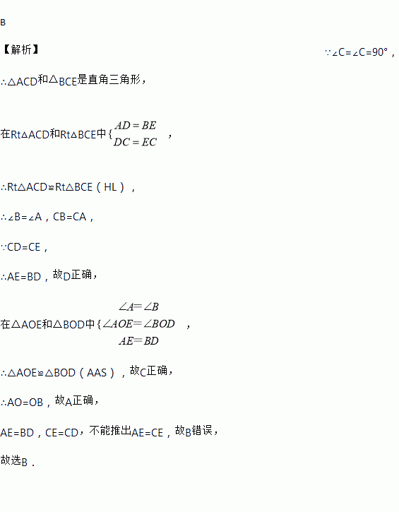 如图所示,在Rt△ACD和Rt△BCE中,若AD=BE,DC=EC,则无法得出的结论是( )