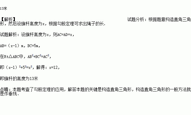 如图,小亮将升旗的绳子拉到旗杆底端,绳子末端刚好接触地面,然后将绳子末端拉到距离旗杆5m处,发现此时绳子末端距离地面1m,请你求出旗杆的高度(滑轮上方的部分忽略不计).