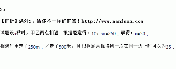 甲、乙两点在边长为100m的正方形ABCD上按顺时针方向运动,甲的速度为5m/秒,乙的速度为10m/秒,甲从A点出发,乙从CD边的中点出发,则经过__秒,甲乙两点第一次在同一边上.