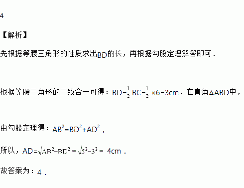 如图,等腰三角形中,,是底边上的高,则AD=________________.
