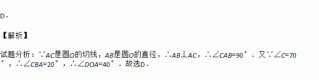 如图,AB是⊙O的直径,AC切⊙O于A,BC交⊙O于点D,若∠C=70°,则∠AOD的度数为( )