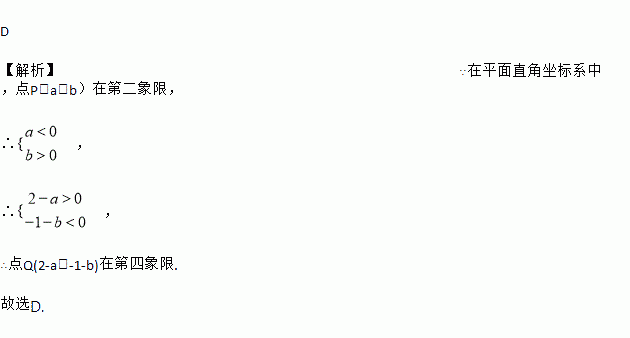 D 【解析】∵在平面直角坐标系中,点P(a,b)在第二象限, ∴ , ∴ , ∴点Q(2-a,-1-b)在第四象限. 故选D.