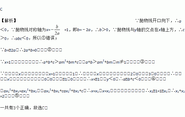 C 【解析】∵抛物线开口向下,∴a<0,∵抛物线对称轴为x= =1,即b=﹣2a,∴b>0,∵抛物线与y轴的交点在x轴上方,∴c>0,∴abc<0,所以①错误; ∵b=﹣2a,∴2a+b=0,所以②正确; ∵x=1时,函数值最大,∴a+b+c>am2+bm+c,即a+b>am2+bm(m≠1),所以③正确; ∵抛物线与x轴的交点到对称轴x=1的距离大于1,∴抛物线与x轴的一...