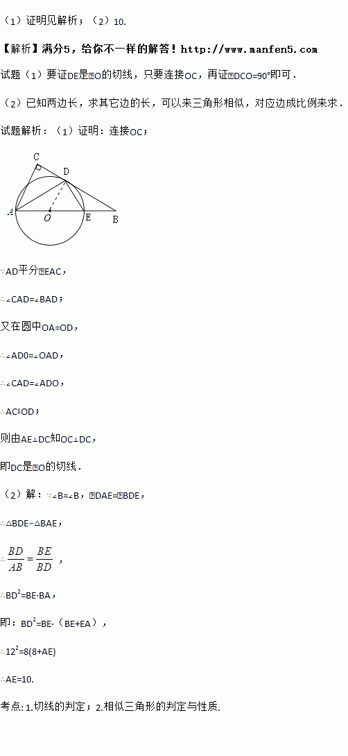 如图,AE是圆O的直径,点B在AE的延长线上,点D在圆O上,且AC⊥DC, AD平分∠EAC