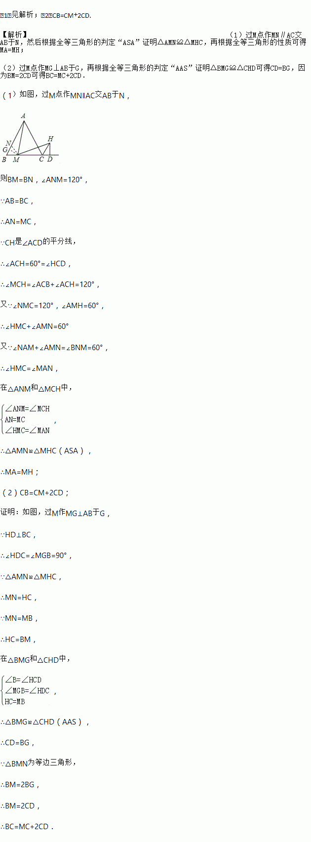 已知,M是等边△ABC边BC上的点,如图,连接AM,过点M作∠AMH=60°,MH与∠ACB的邻补角的平分线交于点H,过H作HD⊥BC于点D