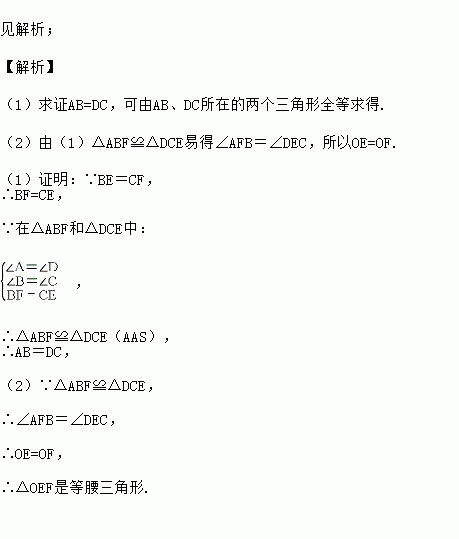 如图,点E、F在BC上,BE=CF,∠A=∠D,∠B=∠C,AF与DE交于点O。