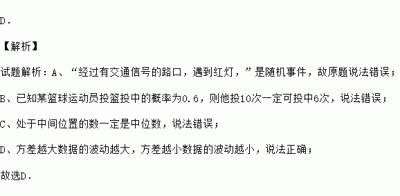 D.方差越大数据的波动越大,方差越小数据的波动越小