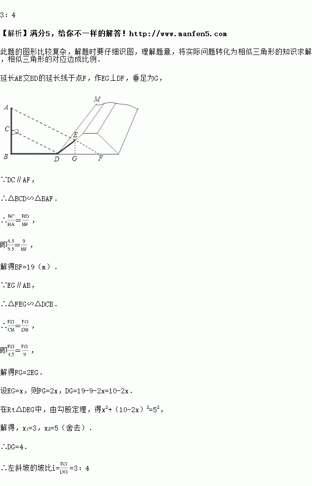 如图,取一根9.5 m长的标杆AB,在其上系一活动旗帜C,使标杆的影子落在平地和一堤坝的左斜坡上,拉动旗帜使其影子正好落在斜坡底角顶点D处.若测得旗高BC=4.5 m,影长BD=9 m,影长DE=5 m,请计算左斜坡的坡比(假设标杆的影子BD,DE均与坝底线DM垂直).