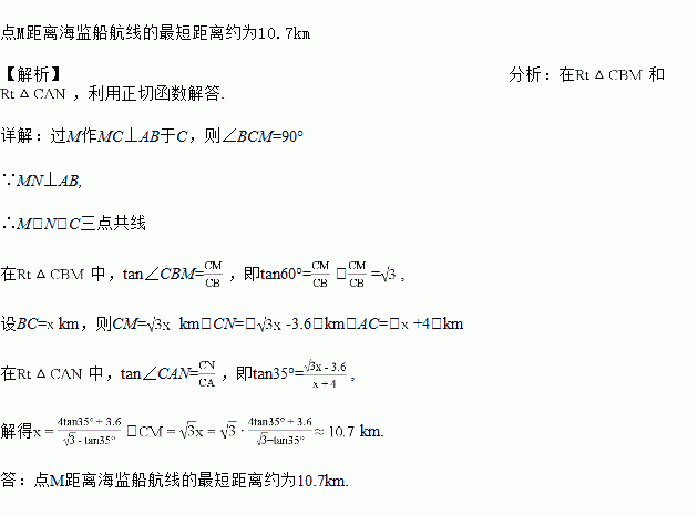 钓鱼岛自古就是中国的领土,我国有 关部门已对钓鱼岛及其附属岛屿开展常态化监视监测. M、N 为钓鱼岛上东西海岸线上的两点,MN 之间的距 离约为3.6km. 某日,我国一艘海监船从 A 点沿正北方 向巡航,在 A 点测得岛屿的西端点 N 在点 A 的北偏东350方向;海监船继续航行 4km 后到达 B 点 ,测得岛屿的东端点 M 在点 B 的北偏东 600方向,求点 M 距离海监船航线的最短距离 (结果精确到 0.1km).