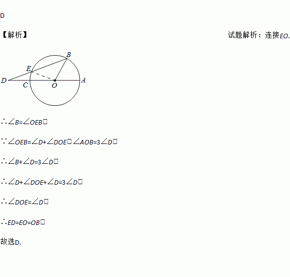 如图,已知AC是⊙O的直径,点B在圆周上(不与A、C重合),点D在AC的延长线上,连接BD交⊙O于点E,若∠AOB=3∠ADB,则( )