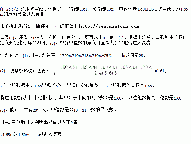 (Ⅲ)根据这组初赛成绩,由高到低确定9人进入复赛,请直接写出初赛成绩为1.65m的运动员能否进入复赛.