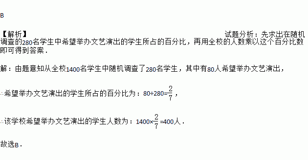 某校为举办“庆祝建党90周年”的活动,从全校1400名学生中随机调查了280名学生,其中有80人希望举办文艺演出,据此估计该学校希望举办文艺演出的学生人数为( )