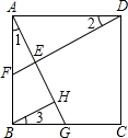 分析:根据正方形的性质可得AB=AD,∠ABG=∠DAF=90°,再根据同角的余角相等求出∠1=∠2,然后利用“角边角”证明△ABG和△DAF全等,根据全等三角形对应边相等可AF=BG,AG=DF,全等三角形对应角相等可得∠AFD=∠BGA,然后求出EF=HG,再利用“边角边”证明△AEF和△BHG全等,根据全等三角形对应角相等可得∠1=∠3,从而得到∠2=∠3,最后根据等角的余角相等证明即可.