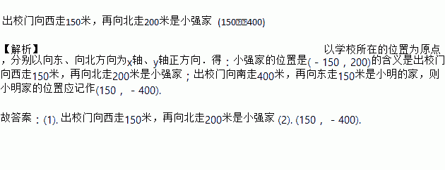 (探究变式)以学校所在的位置为原点,分别以向东、向北方向为x轴、y轴正方向.若出校门向东走100米,再向北走120米记作(100,120),小强家的位置是(-150,200)的含义是_______;出校门向南走400米,再向东走150米是小明的家,则小明家的位置应记作 _____________.