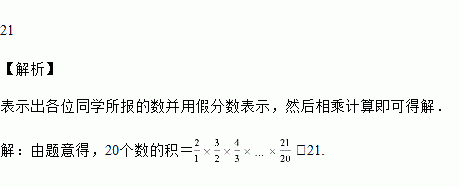 某数学活动小组的20位同学站成一列做报数游戏,规则是:从前面第一位同学开始,每位同学依次报自己顺序的倒数加1,第1位同学报,第2位同学报,…,求这样得到的20个数的积.