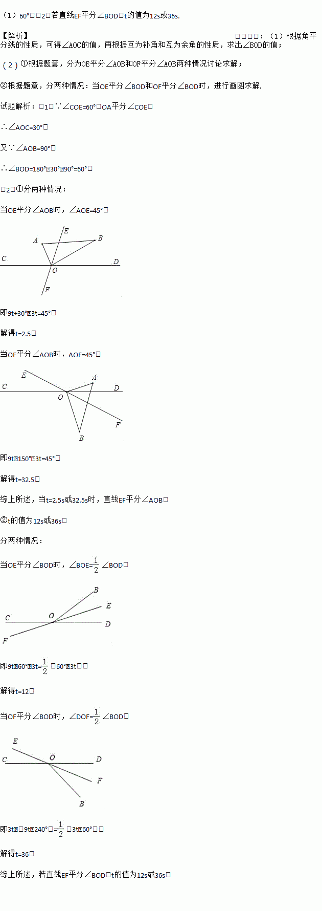 (2)将三角尺AOB以每秒3°的速度绕点O顺时针旋转,同时直线EF也以每秒9°的速度绕点O顺时针旋转,设运动时间为t秒(0≤t≤40).