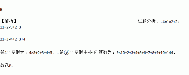 B 【解析】试题分析:∵4=1×2+2,11=2×3+2+3 21=3×4+2+3+4 第4个图形为:4×5+2+3+4+5,∴第⑨个图形中的颗数为:9×10+2+3+4+5+6+7+8+9+10=144. 故选B.