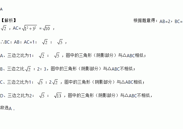A 【解析】根据题意得:AB=2,BC=,AC==, ∴BC:AB:AC=1: : , A、三边之比为1: : ,图中的三角形(阴影部分)与△ABC相似; B、三边之比:2:3,图中的三角形(阴影部分)与△ABC不相似; C、三边之比为1: :2,图中的三角形(阴影部分)与△ABC相似; D、三边之比为2: : ,图中的三角形(阴影部分)与△ABC不相似, ...