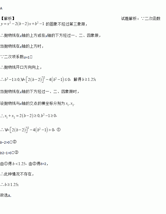 以x为自变量的二次函数y=x2﹣2(b﹣2)x+b2﹣1的图象不经过第三象限,则实数b的取值范围是( )