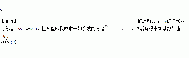 C 【解析】解此题要先把x的值代入到方程中5x-1=□x+3,把方程转换成求未知系数的方程,然后解得未知系数的值□=8. 故选:C.