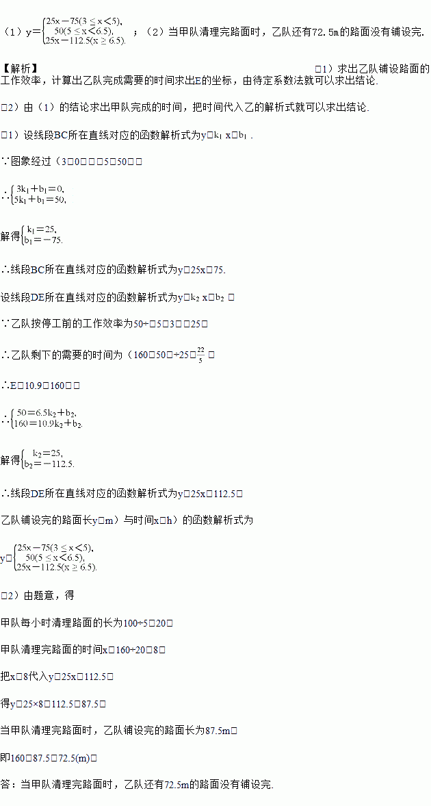 (1)求乙队铺设完的路面长y(m)与时间x(h)的函数解析式;