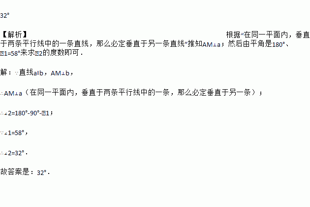 如图所示,直线a∥b,直线c与直线a,b分别相交于点A、点B,AM⊥b,垂足为点M,若∠l=58°,则∠2= ___________ .