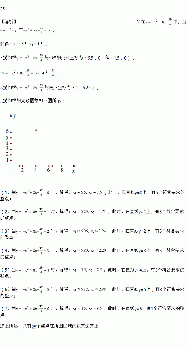 在平面直角坐标系中,横坐标与纵坐标都是整数的点称为整点,如果将二次函数的图象与x轴所围成的封闭图形染成红色,则此红色区域内部及其边界上的整点个数有______ 个