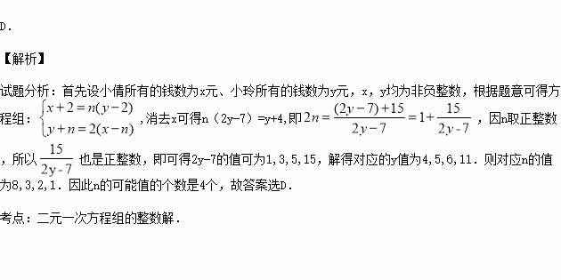 小倩和小玲每人都有若干面值为整数元的人民币.小倩对小玲说:“你若给我2元,我的钱数将是你的n倍”;小玲对小倩说:“你若给我n元,我的钱数将是你的2倍”,其中n为正整数,则n的可能值的个数是( ).