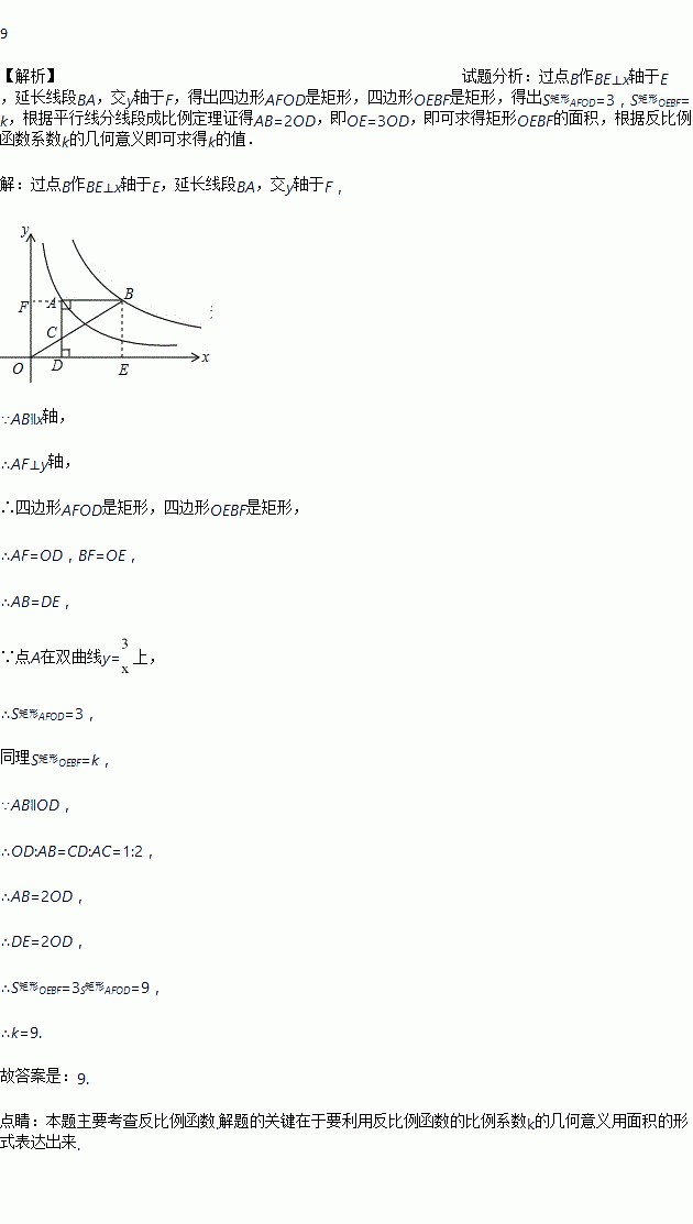 如图,点A在双曲线y=上,点B在双曲线y=(k≠0)上,AB∥x轴,过点A作AD⊥x轴于D.连接OB,与AD相交于点C,若AC=2CD,则k=__.
