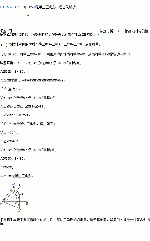 如图,已知点O是∠APB内的一点,M,N分别是点O关于PA,PB的对称点,连接MN,与PA,PB分别相交于点E、F,已知MN=6cm.