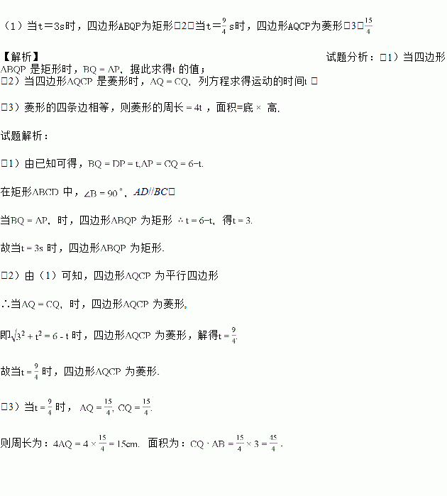 如图,在矩形ABCD中,AB=3cm,BC=6cm.点P从点D出发向点A运动,运动到点A即停止;同时,点Q从点B出发向点C运动,运动到点C即停止,点P、Q的速度都是1cm/s.连接PQ、AQ、CP.设点P、Q运动的时间为ts.